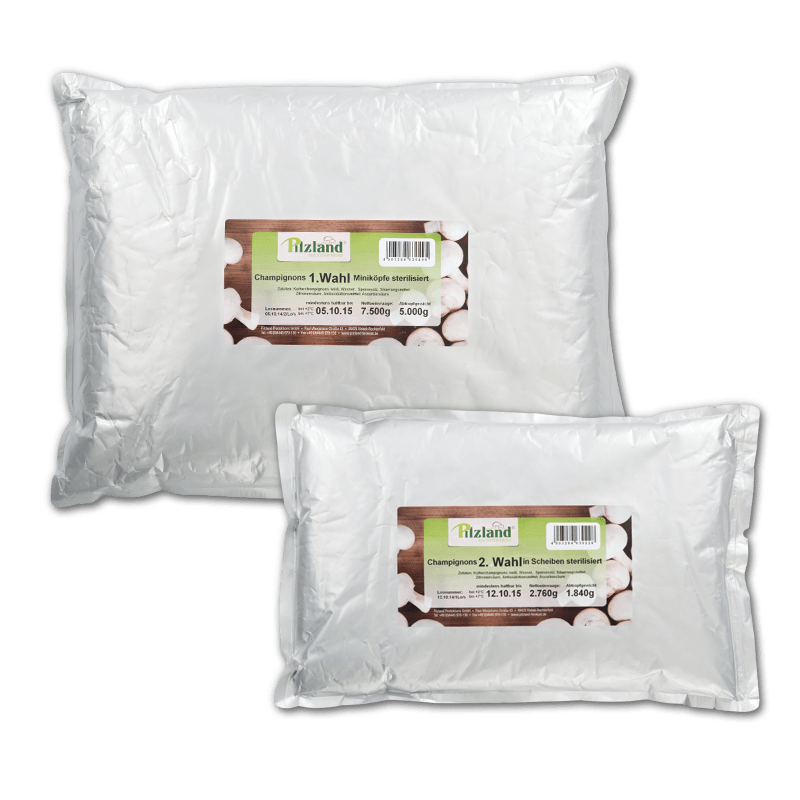 Für die Beutelproduktion werden die Pilze - unter Zugabe einer Lage - heiß in einem Polybeutel abgefüllt. Bei der Eigenproduktion werden die Champignons - ebenfalls nach dem blanchieren - direkt in Eimer abgefüllt, mit kalter Lake aufgefüllt und dann versiegelt.